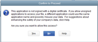Your Quickbooks software has a security feature to prevent unwanted access to its data. When you run the Quickbooks Transformer, Quickbooks will display: