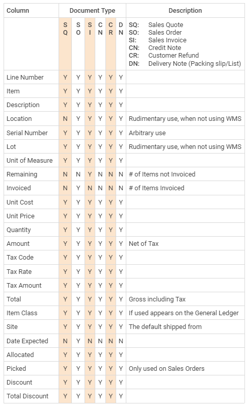 This table shows you what columns are available on which Sales document.