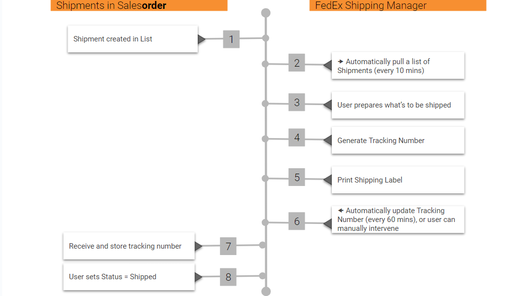 <table><thead><tr><th width="85">Step</th><th>Action</th></tr></thead><tbody><tr><td>1</td><td>Shipments are created in Salesorder.</td></tr><tr><td>2</td><td>Integration automatically pulls the list of Shipments into FedEx Manager.</td></tr><tr><td>3</td><td>User prepares Items/Packages to be shipped, i.e. weigh shipment etc.</td></tr><tr><td>4</td><td>User generates a Tracking Number in Fedex Manager.</td></tr><tr><td>5</td><td>FedEx prints the shipping label.</td></tr><tr><td>6</td><td>Integration automatically updates the tracking number (or, the user may manually update at any time).</td></tr><tr><td>7</td><td>Salesorder receives and stores the tracking number on the Shipment.</td></tr><tr><td>8</td><td>User sets the Shipment Shipping status to 'Shipped', from the List or Shipment. </td></tr></tbody></table>