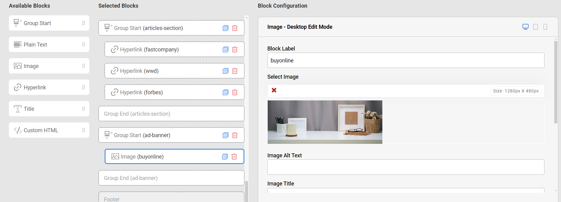 When you add an 'Image Block' to the Selected Blocks list, you can upload or select an image to be displayed.&#x20;